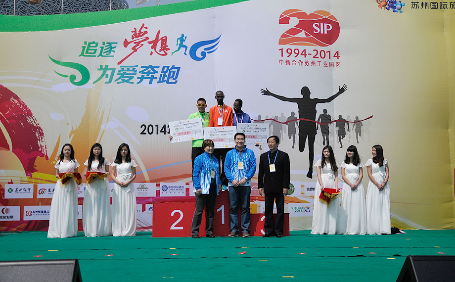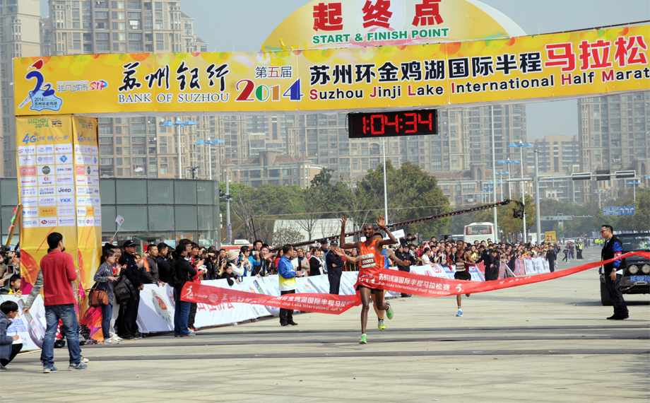 经过激烈角逐, 2014苏州环金鸡湖半程马拉松赛女子组冠亚季军及其成绩分别是:埃塞俄比亚的Zinash Hayile Tola(1:13:23)、中国的刘壮(1:16:32)、肯尼亚的Dorous Chensang(1:17:56),男子组冠亚季军及其成绩分别是:埃塞俄比亚的Lema Birbirsa Tola(1:04:33)、中国的李子成(1:04:34)、埃塞俄比亚的Asrat Demissie Jote(1:04:36)